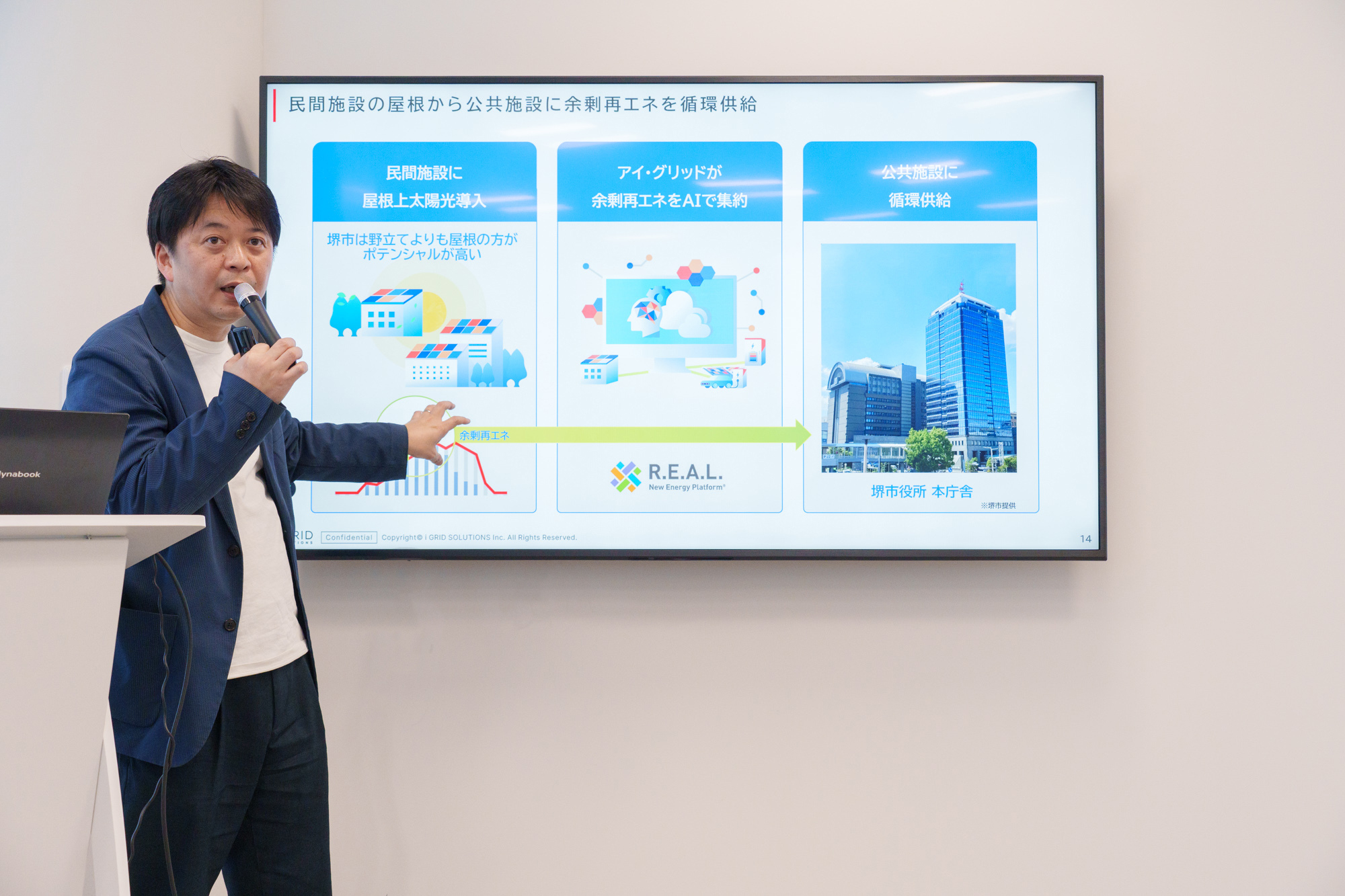 堺モデルでは、市内11社・15施設に太陽光設備を導入し、各施設の余剰電力をAIで集約・制御して市庁舎に供給する。年間の総発電量は550万kWh、CO2削減量は年間約2,600tを見込む。執行役員・岩崎哲氏は「IoTとAIで各施設の発電状況と電力使用量をリアルタイムに把握しながら、余剰を予測して循環させていく」と語った。