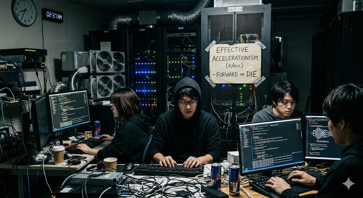 TESCREALの一部と重なりながらも、近年さらに攻撃的かつ急進的な形態としてテック界隈を席巻しているのが「加速主義(Accelerationism)」、特にマーク・アンドリーセンらが公然と支持を表明している「効果的加速主義(Effective Accelerationism: e/acc)」だ。
