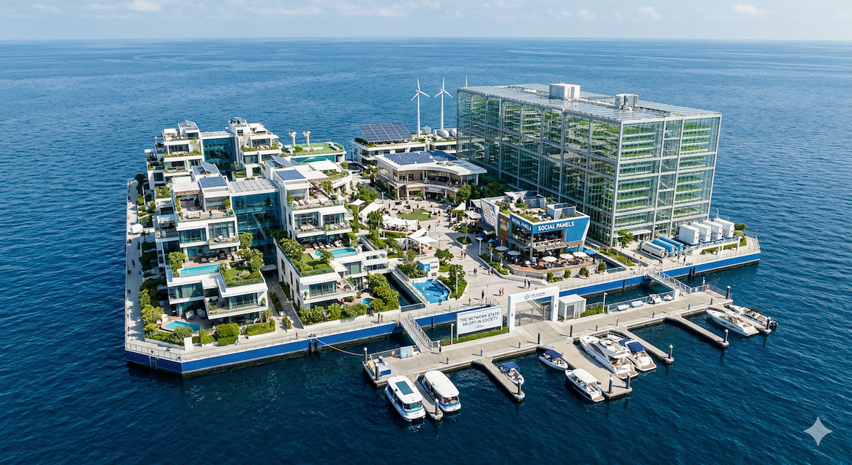 『主権個人』が提示する「メガポリティクス(Megapolitics)」の理論によれば、歴史を動かすのは民主主義的な選挙や議会ではなく、テクノロジー、人口動態、経済の根本的なシフトだとされる。情報化社会への移行に成功した一握りの「認知的エリート(Cognitive Elite)」は、サイバー空間において国家と同等の力を持ち(サイバー戦争においては一人の天才ハッカーが国家軍に匹敵する)、民主主義的な大衆の「厄介な要求(富の再分配や過剰な規制)」から自らを隔離し、私有化された領域へと撤退していくと説いている。ティールがニュージーランドに巨大な土地を購入し、例外規定を用いて市民権を獲得した行動や、海上に独立国家を建設しようとする「シーステディング(Seasteading)」への投資は、この「主権個人としての離脱」というイデオロギーの直接的かつ物理的な実践といえるだろう。