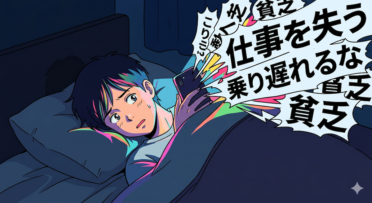 夜、布団の中でスマートフォンを眺めていると、画面の向こうから次々と声が飛んでくる。「このAIを使わない人間は、1年後に仕事を失う」。「今ここで動けない奴は、一生貧乏のままだ」。「乗り遅れるな、歴史が変わる」。タイムラインを流れていく言葉は、どれも語尾を強く跳ね上げ、こちらの胸ぐらを掴んでくるかのようだ。